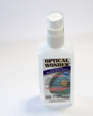 Es gibt eine wirklich große Anzahl an Reinigungsflüssigkeiten die im Fotohandel vertrieben werden, die sicherlich alle gut sind. Ich persönlich verwende seit Jahren die "Baader Optical Wonder Flüssigkeit", die aus dem Astronomiebereich stammt. Die Flüssigkeit kann sogar zum reinigen der hochempfindlichen Spiegel in Spiegelteleskopen verwendet werden. Ich meine, was für die hochempfindlichen optischen Oberflächen im Teleskopbereich gut ist, kann für die optischen Linsen im Fotobereich nur gut genug sein. Die Flüssigkeit lässt sich mit dem Zerstäuber fein aufsprühen und verdunstet beim Reinigen auf den Linsen spurlos. Das Fläschchen sieht zwar nicht so hochwertig aus, ist aber ein richtig gutes Produkt. Ein 100ml Fläschchen reicht über Jahre!